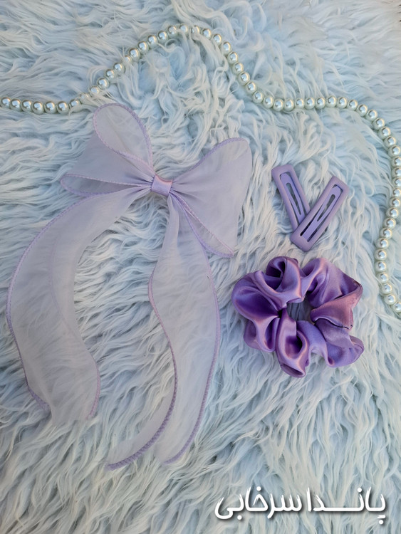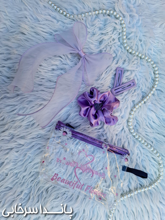 پک هدیه اکسسوری مو یاسی ۴ تیکه کیف لوازم آرایش. پاپیون فرانسوی. اسکرانچی و گیره مو