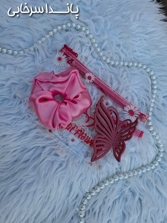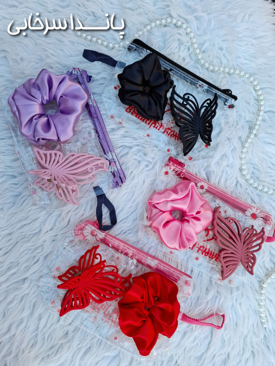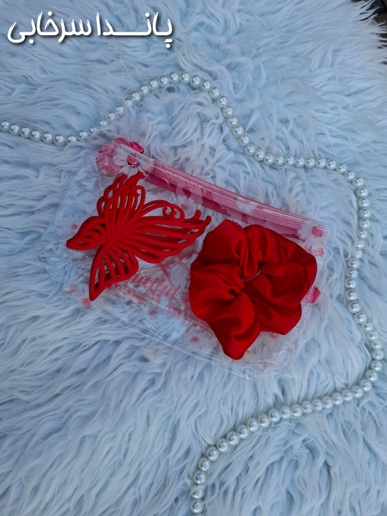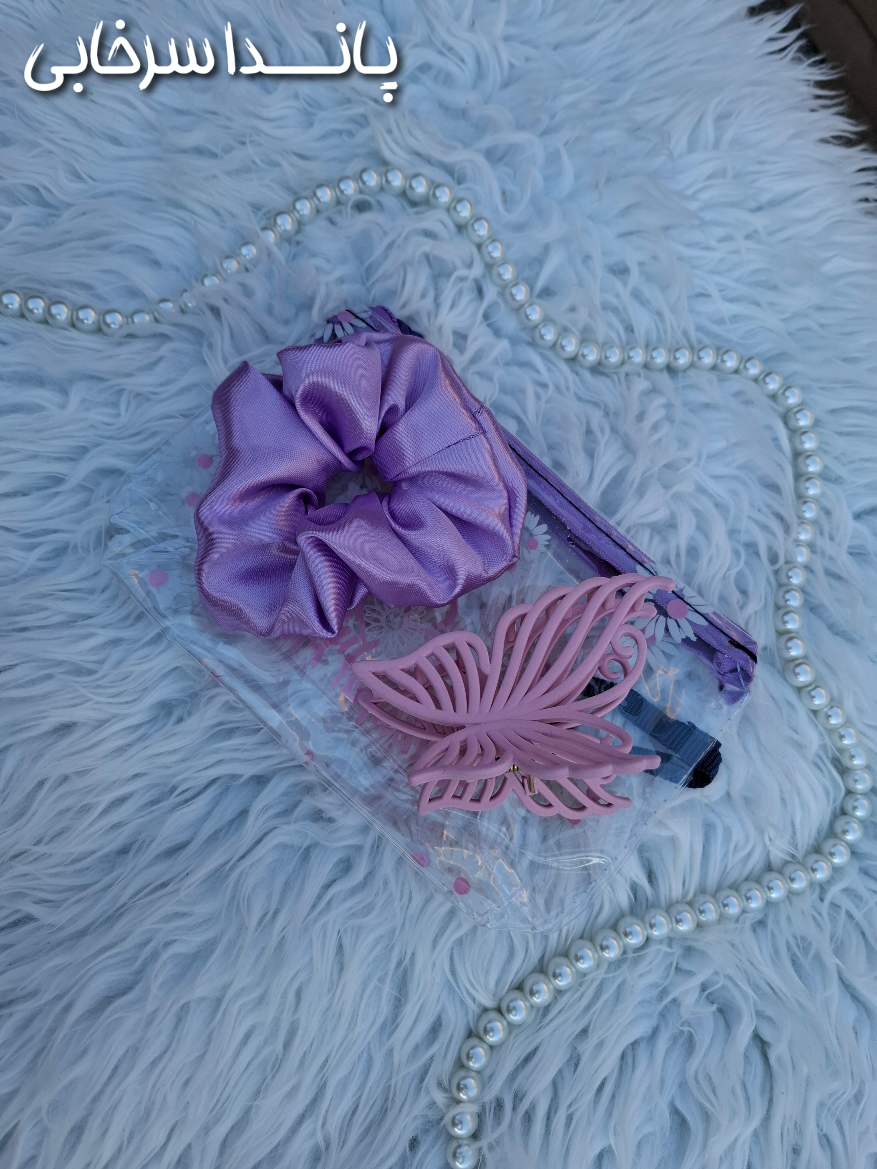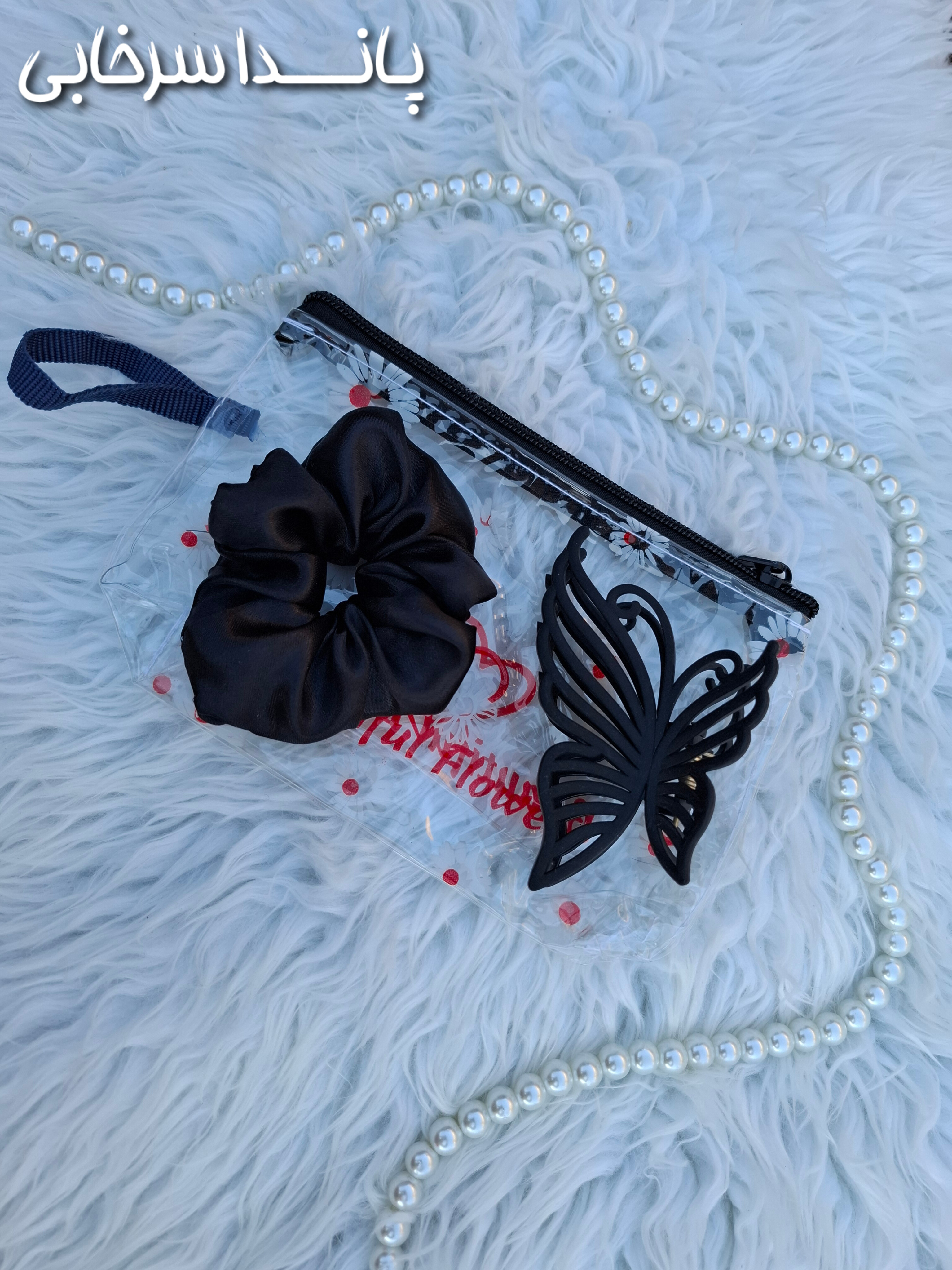 پک هدیه اکسسوری مو ۳ تیکه کیف لوازم آرایش. کلیپس سایز سوپر پروانه و اسکرانچی